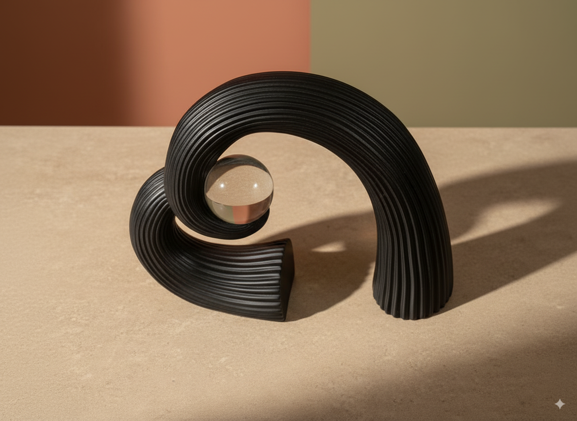 Bring bold style into your home with the Abstract Black Sculpture. Smooth ribbed curves and a clear glass sphere combine art, minimalism, and elegance. Display it in your living room, office, or entryway to add character and a touch of luxury.