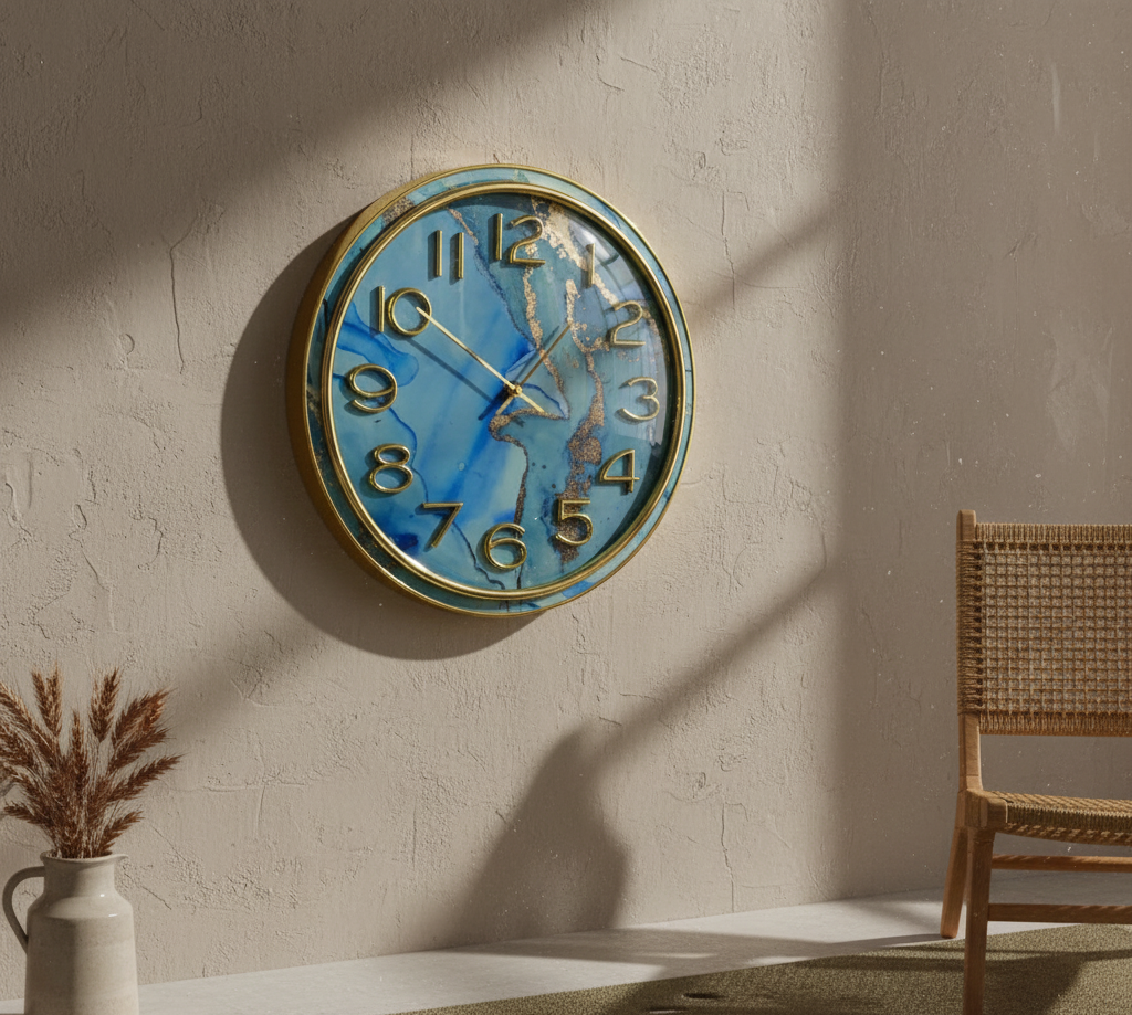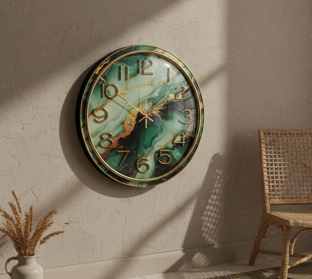 Savor the sophisticated elegance of our Black Marble Gold Wall Clock, a work of contemporary luxury that perfectly embodies upscale interior design with its captivating black marble-effect dial swirled with elaborate gold veining. The polished gold frame adds a glamorous touch that enhances any room, and the bold gold numerals (1–12) and elegant gold-toned hour, minute, and second hands guarantee effortless readability. This wall clock is made of lightweight metal alloy and premium, shatter-resistant glass, making it durable enough to endure daily use without fading or tarnishing. With just one AA battery (not included) and a dependable, silent quartz movement, it operates accurately and without ticks, making it ideal for calm settings like bedrooms or study areas. Its adaptable design goes well with marble, gold, black, or neutral color schemes, whether it is used to decorate a professional office, a minimalist living room, or an exquisite dining area. This clock is a must-have for anyone looking for luxury wall clocks, marble decor clocks, gold-framed analog clocks, silent battery wall clocks, and contemporary marble pattern timepieces because it is simple to hang with a secure rear hook, rust-proof, and low maintenance.