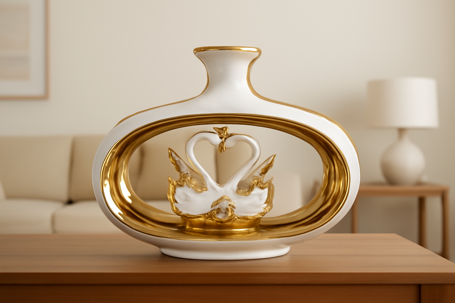 Regal Swan Embrace Ceramic Centerpiece – Luxe White and Gold Statement Décor